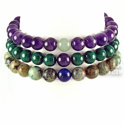 A stacked collection of 3 mala bracelets with adjustable slide knot & 3 holed guru bead: