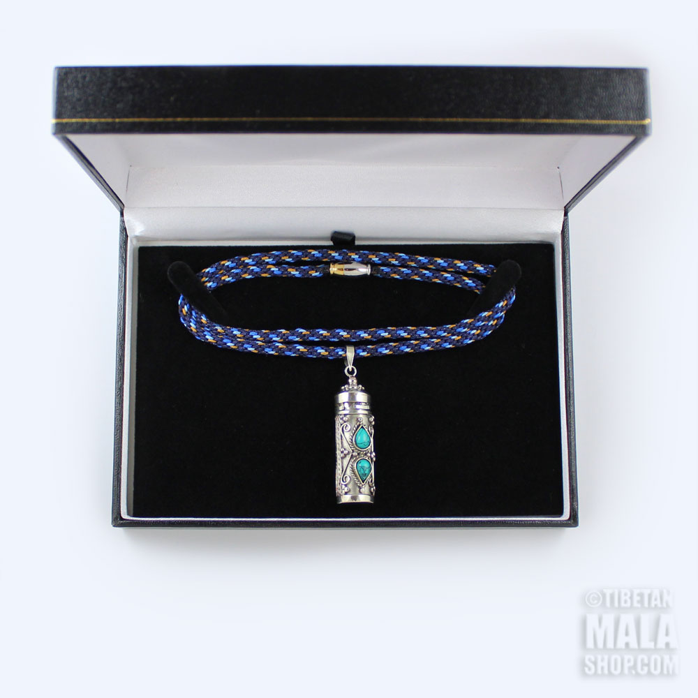 The prayer box pendant has a removable lid – inside is a roll of paper printed with a choice of Buddhist deity mantras.