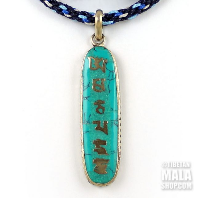 Long Om mani turquoise pendant inlaid with brass, pendant measures 5cm long